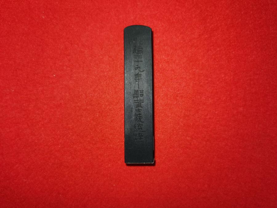 此墨成对。一面写“陶斋尚书审释金石墨”。另一面用隶书写“光绪二十九年黟山黄士陵选烟”。根据墨上的文字信息,可以得知这是黟山黄士陵让人制作的这一对墨,送给陶斋尚书,即端方赏玩的。1901年,端方擢升为湖北巡抚。端方麾下的幕僚人数逐渐增多。金石书画的学术氛围愈发的浓厚。1902年,端方招募黄士陵来武昌,在其手下工作大约两年的时间。墨上所记录的“光绪二十九年”,即1903年。这段时间里,黄士陵参与了《陶斋吉金录》的编撰,并为端方制墨、刻章。文人自制墨,是文人墨客、达官显贵们在墨店或请制墨者按自己的审美情趣来定制、题铭、珍藏的专用墨。