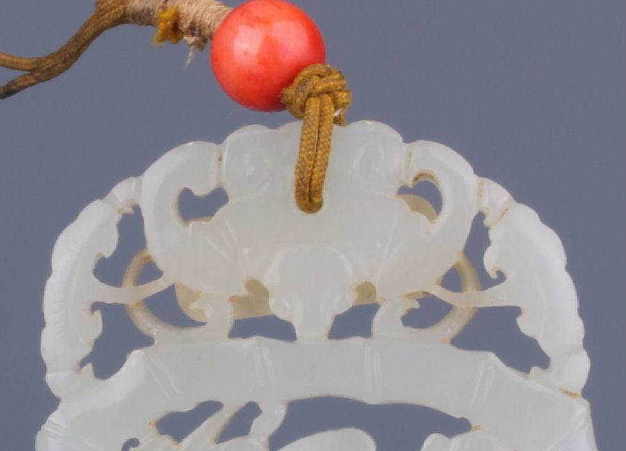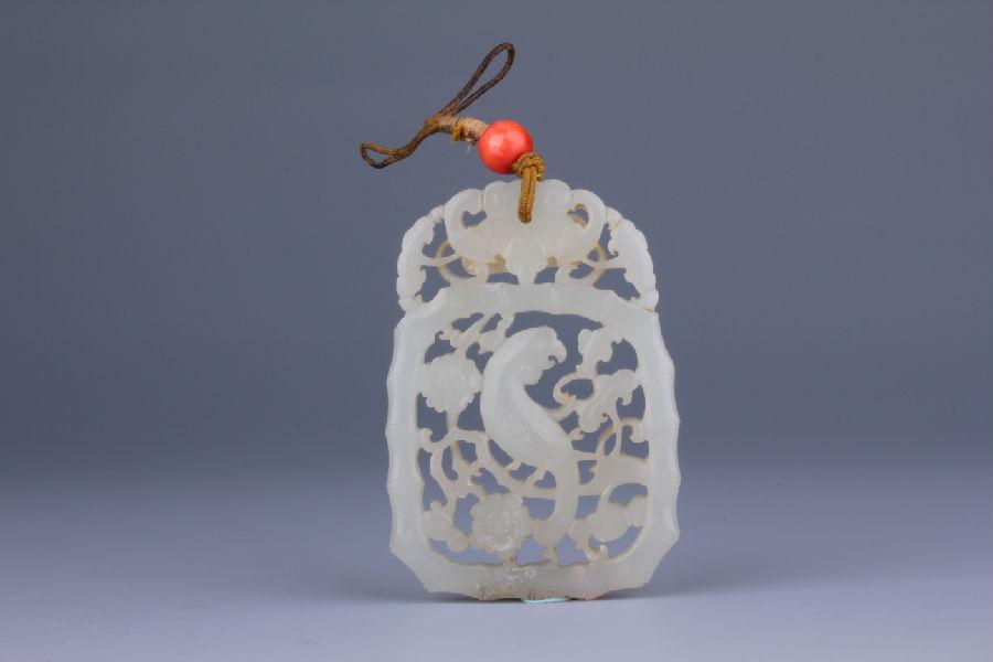 馆藏清代镂雕鹦鹉花卉纹玉佩,玉色青白,玉质温润。玉佩整体呈略长的椭圆片状,采用镂雕为主的雕琢方法。佩的首部镂雕蝙蝠纹,蝙蝠头朝下,双眼凸出,呈展翅飞翔状,中间有穿,上系棕色丝绳,绳上有一粒红色珠子。