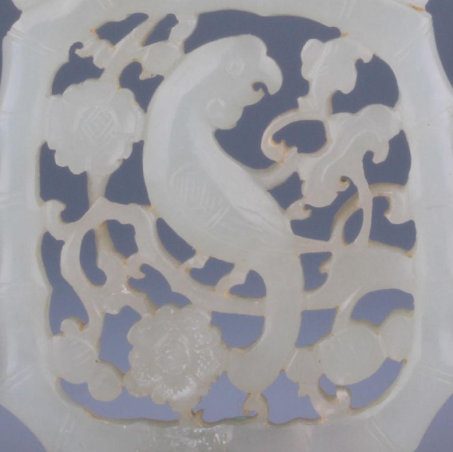 唐代宫廷喜饲养鹦鹉,鹦鹉纹开始流行于晚唐各类材质的器物上。清代的玉雕佩饰样式繁多,北京艺术博物馆藏中共有4件镂雕鹦鹉花卉纹玉佩,造型大致相同:或圆或椭圆的框中,镂雕回首呈S形身姿的鹦鹉,周围再辅以花卉装饰,基本为程式化的样本且具有强烈的装饰感。其中,本次向大家介绍的这一件镂雕鹦鹉佩饰,玉色最为纯净,玉质最为细腻,玲珑剔透,属其中精品。