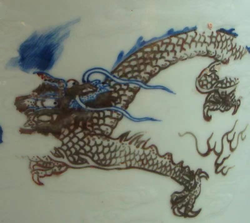 口径18厘米,底径17.6厘米,高14.7厘米。胎壁较厚,重1995克。造型为圆口,直身,口沿外敞,腰腹微束,玉璧形底。通体施白釉,外壁以青花、釉里红、豆青三种釉下彩装饰。主题画面由一条在云中穿行的巨龙和在山间行走的猛虎组成,气势磅礴,场面壮观。龙身以釉里红绘制,并以青花勾勒龙头、背脊、须发等,刻画生动,雄健威猛。虎身以青花勾勒轮廓,以釉里红绘制皮毛斑纹,笔法细腻,栩栩如生。