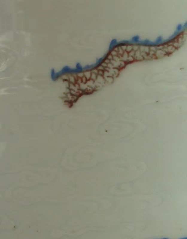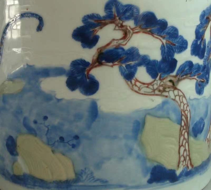 周围环境清幽雅致,分别以青花描绘远山云雾,釉里红饰苍松翠柏,豆青色填涂山间怪石,色阶丰富,层次分明。另外,在大面积的留白部位浮雕云气纹。因云气的轮廓线是在胎上刻划而成,故在光线照射下若隐若现,给人以空灵之感。