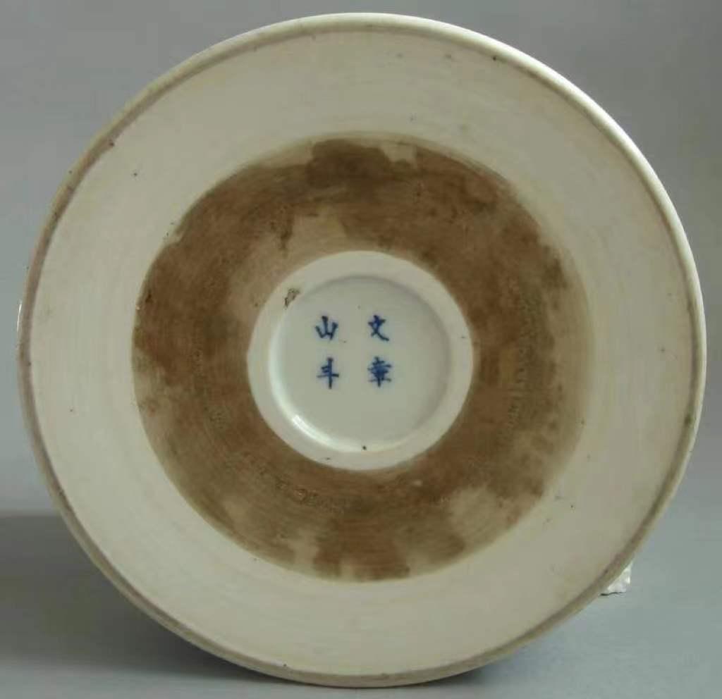 玉璧形底的内、外两圈施白釉,中圈涩胎,明显见有细密的旋坯痕。中心内凹,并书青花“文章山斗”四字。“文章山斗”是清康熙时期景德镇瓷器上的流行款识之一,具有重要的断代意义。语出自《新唐书·韩愈传》:“自愈之没,其言大行,学者仰之如泰山北斗云。”意思是指文章为人所宗仰,用于笔筒上做款识可谓相得益彰,别具新意。