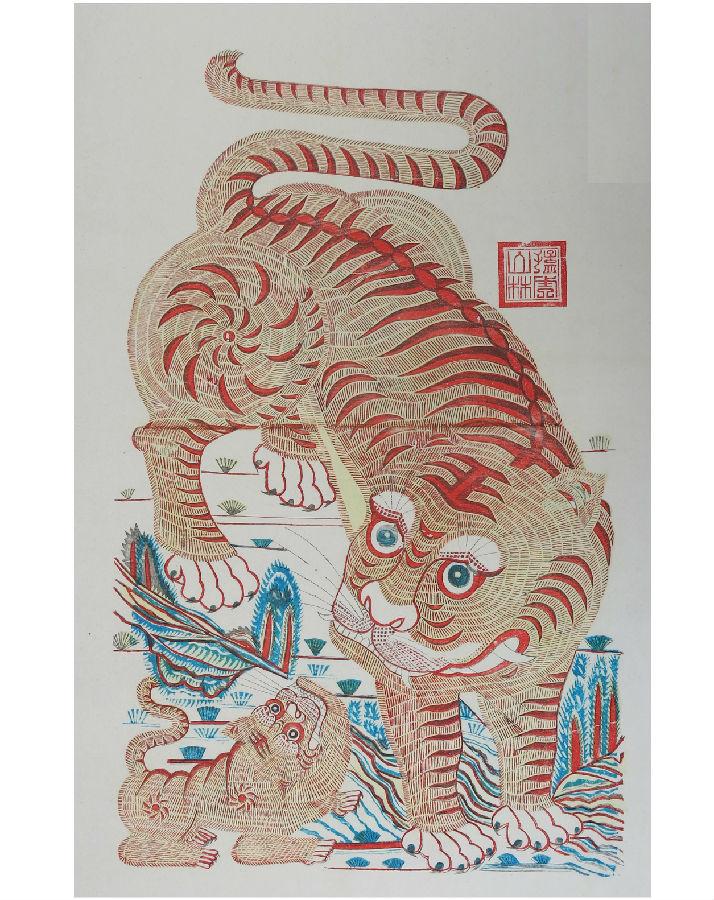 北京艺术博物馆藏杨家埠木版年画中有以老虎为主题的《山林猛虎》,该画以黄色为主色,在老虎身上配有红色花纹。猛虎呈下山姿态,体态雄伟,尾部高高扬起,虎牙狰狞毕露,颇有威震山林的气概。其旁有一只小虎,仰头对视,又具有特殊的亲和力。画上另影“山林猛虎”大印一枚。