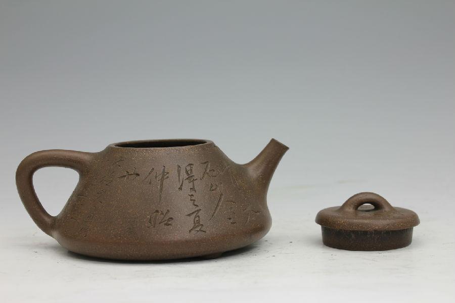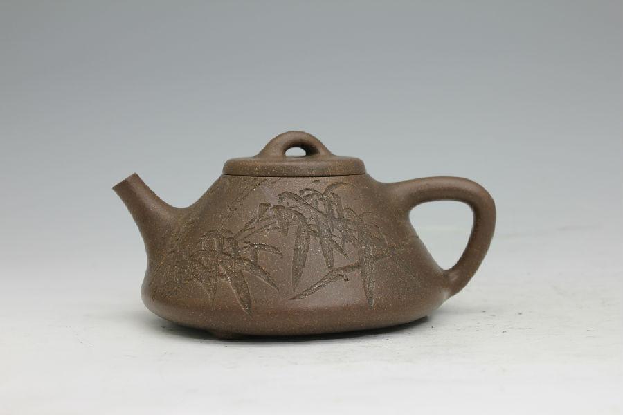 壶身上所刻的竹纹,是“子冶石瓢”式常见刻纹。瞿应绍本人爱竹、画竹,其画竹颇有郑板桥之韵。所刻竹纹,多在细砂器物上。下刀流畅,力道刚劲,廖廖数笔,给人以生动、古朴典雅之感。