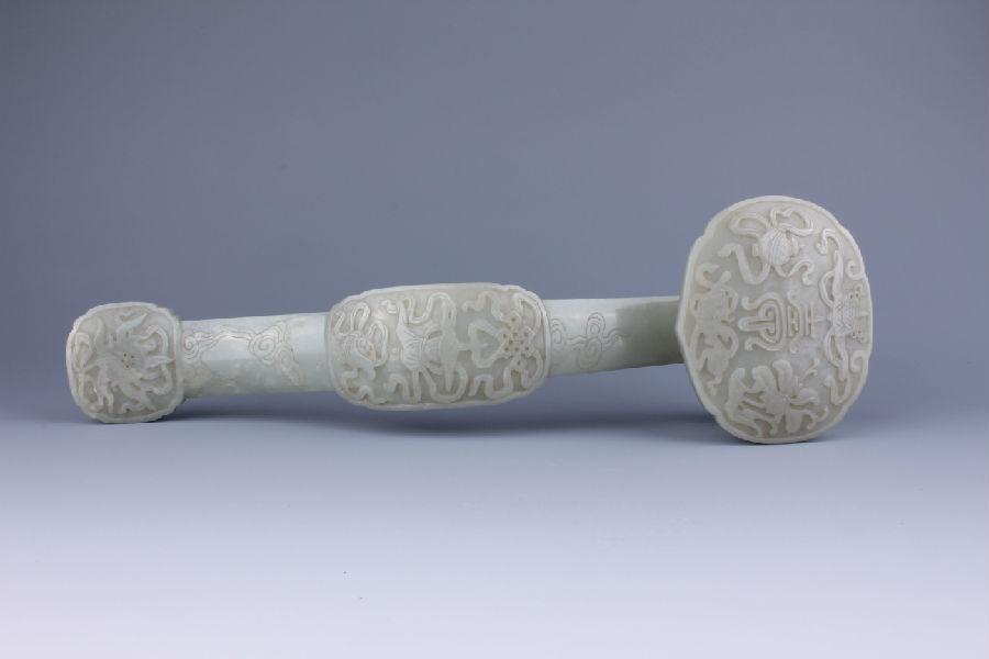 北京艺术博物馆藏青玉如意,如意头中间刻篆体的“寿”字。在“寿”字周围以及柄的正面,浅浮雕有佛教的八宝图案,象征着吉祥、幸福、圆满,因此这柄如意寓意是“福寿吉祥如意”。