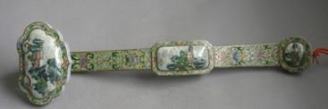 北京艺术博物馆藏的粉彩开光海屋添筹图如意,如意头呈云状,开光内绘有海屋添筹图。“海屋添筹”出自苏轼的《东坡志林》,是传统的祝寿图案,因此这柄如意有“福寿如意”的吉祥寓意。