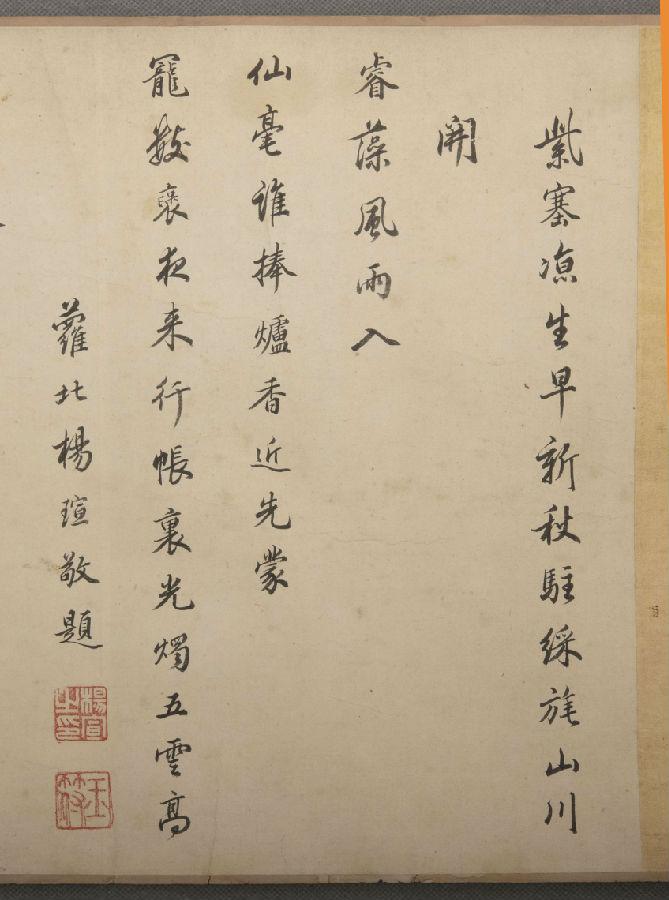 8月4日,仲夏的北京气温高达35℃以上,酷暑难耐,康熙帝启程前往热河,当日驻跸花峪沟,13日抵达喀喇和屯。庄严的皇家仪仗队缓慢前行在御道上,康熙帝端坐金辇,前后簇拥着随驾的朝廷命官、武将兵士、太监侍从、嫔妃宫女……。经过数年建设,联接京城与热河这两座皇城的御道早已建得相当平整,御道用宽度相当的巨石铺就,两侧每十里就设有供皇帝休憩的驿站,路旁遮荫的柳树、槐树早已长得郁郁葱葱,不远处庄稼地里的小麦、玉米、高粱都抽了穗,与人齐高。到1703年热河行宫全部建成时,此御道便固定了数千人专门养护清扫。在树荫凉意和百谷畅茂的感染下,康熙帝一路上兴致盎然,以书射为事。到17日,扈从的大学士、翰林官等俱齐集行宫前奏曰:皇上巡幸塞外于万几余暇。臣等日见皇上神射,发无不中。伏求皇上御书之时,亦赐臣等赡仰。听闻臣子们的奏请,康熙帝兴致高涨,率诸皇子等出行宫门外。见大学士翰林官等早已侍立两旁,康熙帝便挥毫染翰,坐书大字小字顷刻数十纸。诸臣聚观,无不惊喜。18日,康熙帝驻跸热河上营,由于鸿胪寺少卿法生“多才好学,善于吟咏”(内侍强国忠语),加之一路勤勉侍奉,康熙帝特赐其御书两件。一件成扇,上书东坡诗二十八字;一件手卷,上书唐句二十字,以示褒奖。后者即馆藏的这件“康熙帝御笔行书五言唐诗卷”。法生在这次随驾途中,幸运地得到康熙帝御笔两件共四十八字的赏赐,真可谓是君恩罔极。要知道,庞大的随驾队伍中,也仅有领侍卫内大臣福善获得御书“经远世臣”,大学士马齐获得御书“永世翼戴”各四字而已。难怪他在跋文中感叹:臣生遭逢盛会,获兹异宝。君恩罔极,刻骨镂心。凡我世世子孙,宜如何报也。