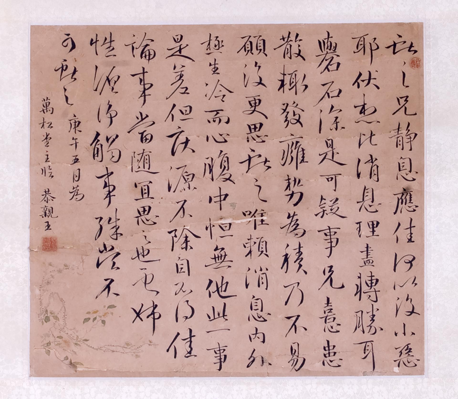 北京艺术博物馆馆藏三百余件清代皇室及其后裔的书画作品。从顺治到宣统,除同治帝作品阙如外,其他九位皇帝佳作,还有慈禧皇太后、荣惠皇贵妃、端康皇贵妃等后宫女性,直郡王允禔、果亲王允礼、成亲王永瑆等宗室的书画作品均有收藏。本次展出的藏品,使用的纸、墨、印泥精益求精,展现了清代皇室拈毫点染的精湛造诣,体现出皇室书画较高的艺术水平。