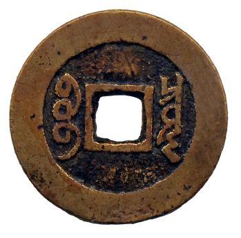 此类康熙通宝有一个独特的称呼,被称为“罗汉钱”。与普通“康熙通宝”相比,“熙”字为左边少一竖划。此枚“罗汉钱”制作精良,铜质光亮,背面为满文“宝泉”二字,是户部宝泉局专为康熙皇帝六十寿辰而铸的一种祝寿钱。