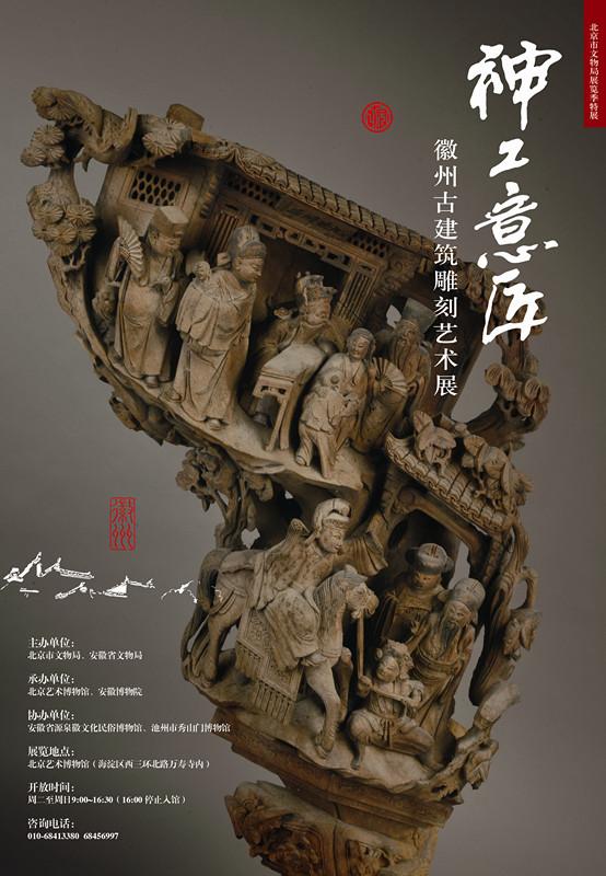 《神工意匠——徽州古建筑雕刻艺术展》将于2014年8月22日至2014年11月18日在北京艺术博物馆展出。展览汇集安徽博物院、安徽省源泉徽文化民俗博物馆、安徽秀山门博物馆收藏的徽州古建筑雕刻构件90余件,通过展示精美的徽州木雕、砖雕、石雕,为首都市民提供了解徽州建筑文化的平台。