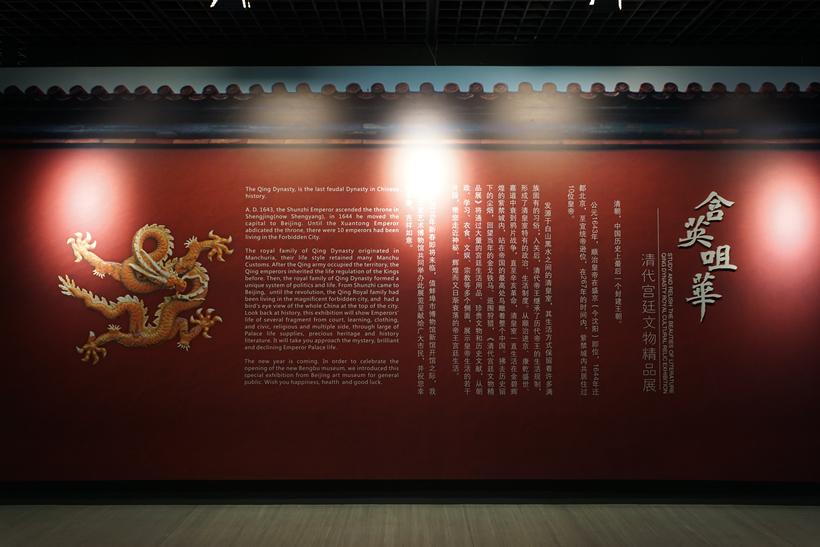 本次展览由北京市文物局所属北京艺术博物馆策划,共聚馆内珍藏清代各时期宫廷珍贵文物111件套,展览分为“皇权篇”、“宸居篇”、“文化篇”和“宗教篇”四大部分,涉及官窑瓷器、皇家绣件、文房用品、封赏诰命、御笔书画等众多门类,展出的文物中既有清代各时期代表性的官窑瓷器,深宫内廷中曾经使用的绣品、佩饰和文玩用具等,更有与清朝历代帝王直接关联的重要的历史见证:如顺治帝为将领及家属颁发的封赏诰命;康熙、雍正、嘉庆、道光乃至末代皇帝宣统的御笔书法墨宝;咸丰、光绪帝及慈禧太后留下的书画精品;皇帝在重要场合所穿吉服袍;昔日皇室后裔的扇面作品等等。在中华文明历史上,清王朝占据267年,从金戈铁马的征战到入主中原,创康乾盛世,经同治中兴,历鸦片战争,至辛亥革命,清朝的灭亡同时结束了中国长达两千年的封建统治。中国千年的儒家传统文化没有因少数民族政权的入主而中断,而是继续传承和发扬,这与清代帝王对儒家文化的极力推崇甚为关联。深度展现了清代宫廷生活的一个侧影。