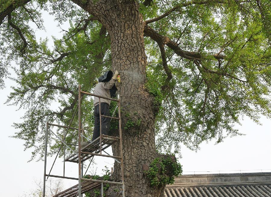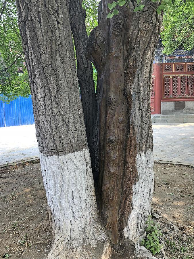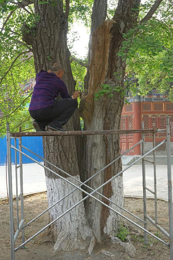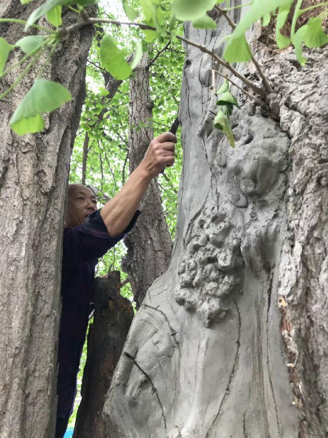 古树维护杀虫除糟朽之后要用水泥封上伤口。雕刻封口水泥,让它们与真的树干融为一体,王师傅做的得心应手,没有CAD制图、没有美工师设计、没有“专家批复的方案及修改意见”,哪里该模拟树皮,哪里该模拟树干,一双劳动的手一把刻水泥的刀,把根瘤、断枝、风化的年轮、干裂的树皮模拟得惟妙惟肖。水泥干后再做防水和涂色。实践出真知,社会大课堂,令人敬佩!