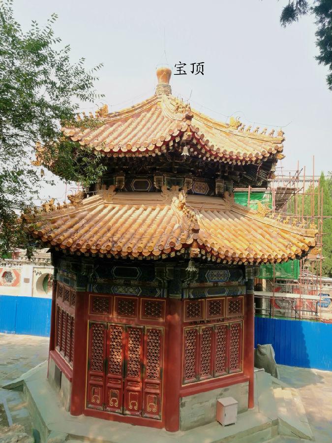 下面就是万寿寺正在修缮的中的歇山顶建筑,上图中原木色的三角区域叫小红山。刷了油漆之后,就是下图的样子。