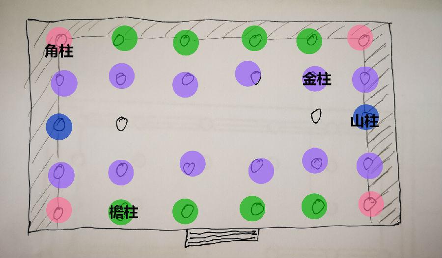 金柱:在檐柱以内的柱子,除了在建筑物纵中线上的都称金柱。上图内层安装门窗的柱子即为金柱。