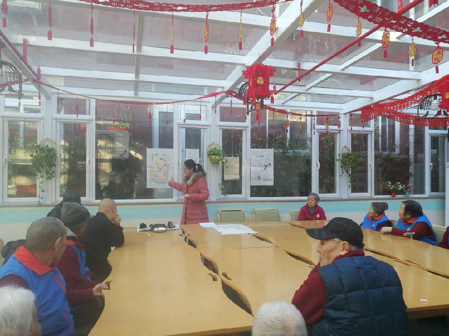 此次活动结合即将到来的我国传统节日春节,首先由北京艺术博物馆孙秋霞老师向敬老院老年人介绍年画历史,讲解年画习俗,并着重介绍了天津杨柳青木版年画艺术特色。接下来由王田老师和张杰老师演示木版年画的制作过程,协助老年人现场体验印刷木版年画“九九消寒图”,整个活动洋溢着温馨、喜庆的节日气氛。在活动最后,敬老院工作人员也兴致勃勃地参与到活动中来,亲自体验了“莲年有余”木版年画印刷技艺。