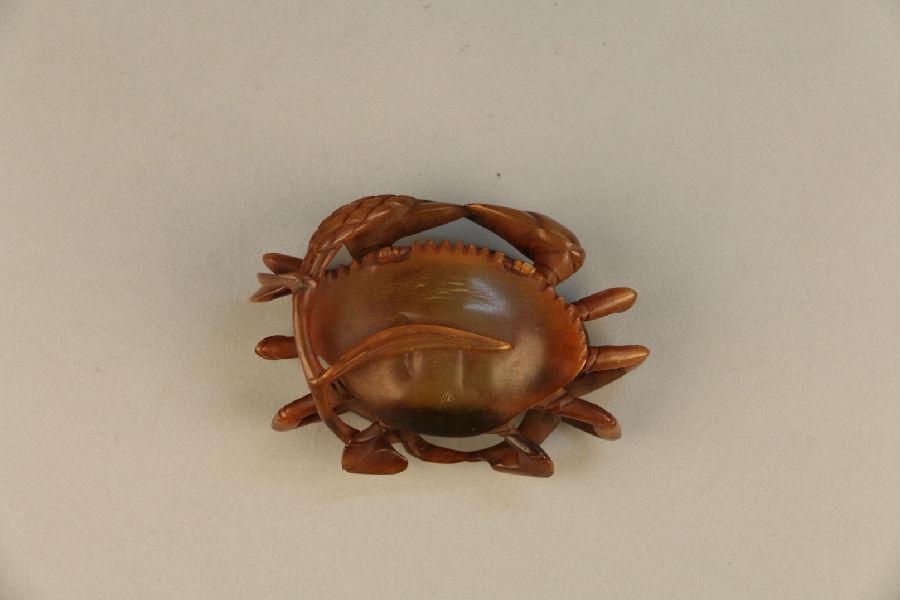 螃蟹在中国古代便是一道美食,品蟹、饮酒、赏菊、登高等是古人秋季重要的社交活动。明清时期,螃蟹的寓意得到升华,成为文人绘画和工艺品雕刻的重要题材之一。绘画螃蟹或摆放螃蟹造型的摆件于书房案头,即寓意了考取科举功名的美好愿望,又是文人对自然野趣的追求。在北京艺术博物馆众多的明清工艺品中,出现了不少螃蟹的形象。它们材质不同、形态各异,或动或静、具有艺术表现力,体现了当时人们的思想生活和审美意趣。