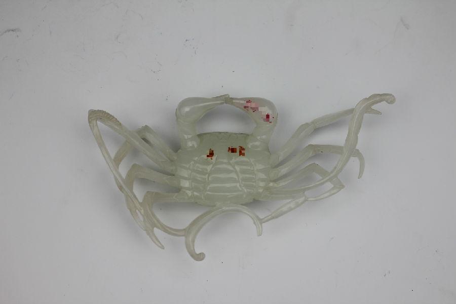 以白玉雕刻螃蟹实在是奢华,馆藏清代白玉圆雕蟹,玉质纯净、玉色均匀,是难得的精品。螃蟹以一块白玉料圆雕而成,长12.3厘米、宽8.3厘米、高2.2厘米,并附有木座。螃蟹整体呈伏卧爬行状,双螯合置于身体前端;蟹腿一侧舒展一侧蜷缩作爬行状,左边的蟹腿处镂雕一根细长芦苇叶似螃蟹正爬过荷塘。蟹壳上缘凸雕螃蟹的圆眼睛,表面琢制出凹凸不平的质感,腹部以阴刻线琢刻蟹的嘴和尖脐,蟹螯、蟹腿、蟹壳背面均施以一组组短阴刻线表示蟹的绒毛。整体琢刻极为写实。