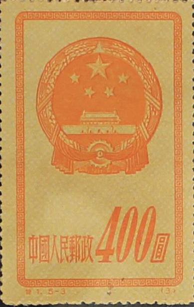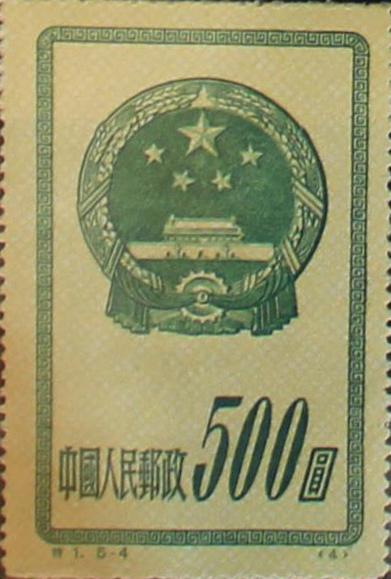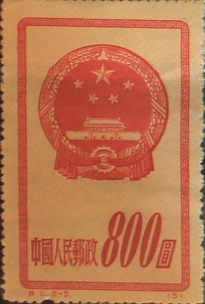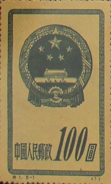 1951年10月1日为了庆祝中华人民共和国建国二周年,邮电部发行的志号为特1的《国徽》特种邮票。一套5枚,图案相同颜色不同,分别为蓝、橙、绿、红、棕色。国徽是中华人民共和国的象征和标志,在邮票《国徽》图案周边绘制了直线折成90度的二方连续回纹花边,极具民族风格。