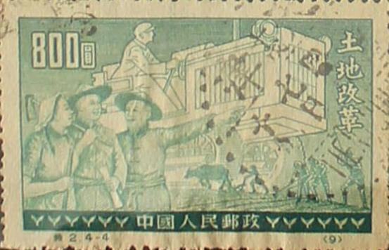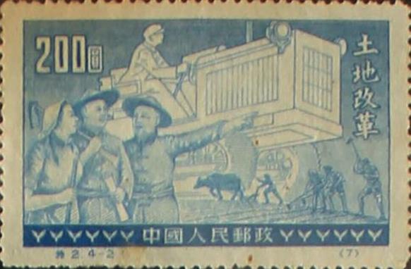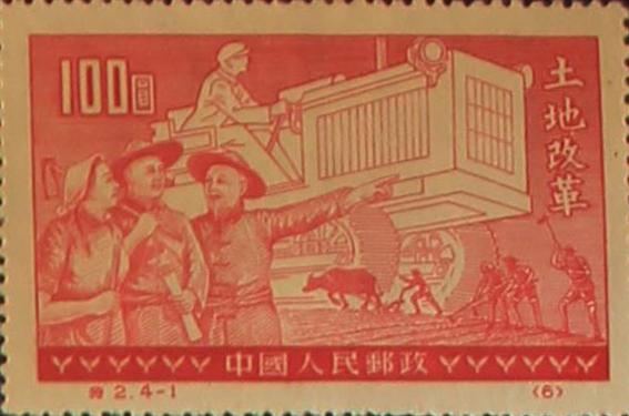 1952年1月1日发行的《特2—土地改革》邮票一套4枚,紧密配合当时全国土地改革。邮票的主图案背景是一台正在作业的巨型拖拉机,衬托前景分得土地的、怀着无限喜悦的农民,以满腔的热情在自己的土地上辛勤耕作的情景。