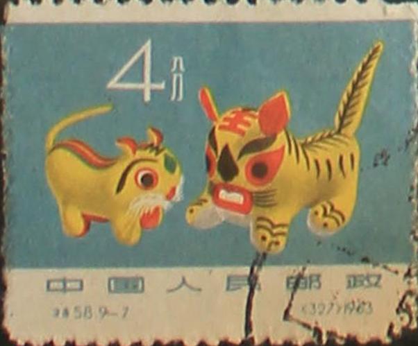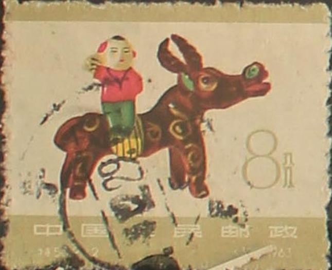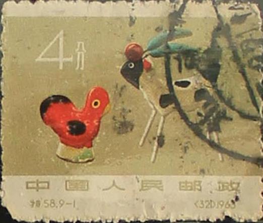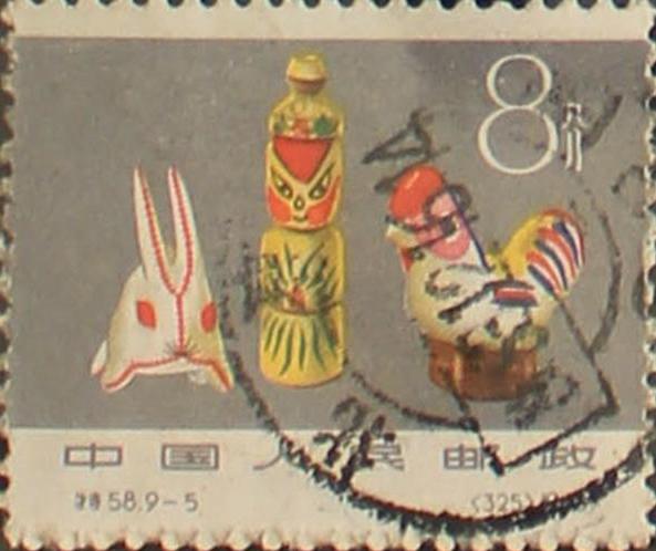 1963年12月10日发行的《特58—民间玩具》,一套9枚,北京艺术博物馆收藏其中8枚。民间玩具作为中国民间工艺美术的一种独特的艺术形式,不仅富有浓厚的民俗趣味和生活气息,还带有浓厚的地方特色。分别为:1、泥塑-鸡(无锡)和泥塑-羊(北京);2、泥塑-春牛(上海);3、布艺-驴(蚌阜)和泥塑-鸟(青岛);4、布艺-骆驼(北京);5、布艺-白兔(北京)、木-棒棒人(邯郸)和泥塑-公鸡(北京);6、泥塑-狮子(天津);7、布艺-小虎(青岛)和布艺-大虎(北京);8、麦秸-花公鸡(上海)