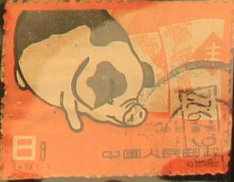 发行于1960年的《特40—养猪》特种邮票,一套5枚。分别是:繁殖、防疫、肥猪满圈、猪食堂、肥猪满仓。这套邮票的五幅图案分别采用了不同颜色作为主基调,展现养猪事业的蓬勃发展。图中猪的形象,身体圆润、神态各异,给人一种生活温馨和幸福的感觉。