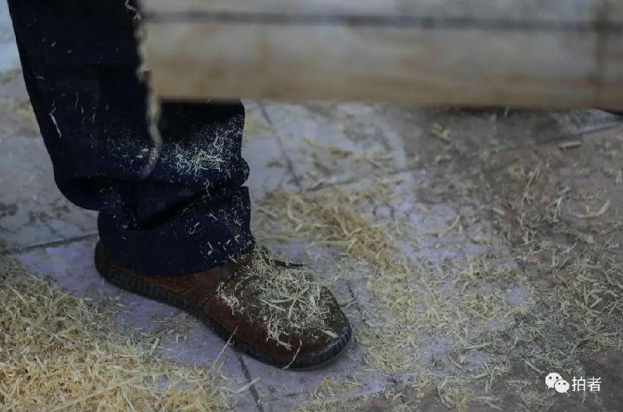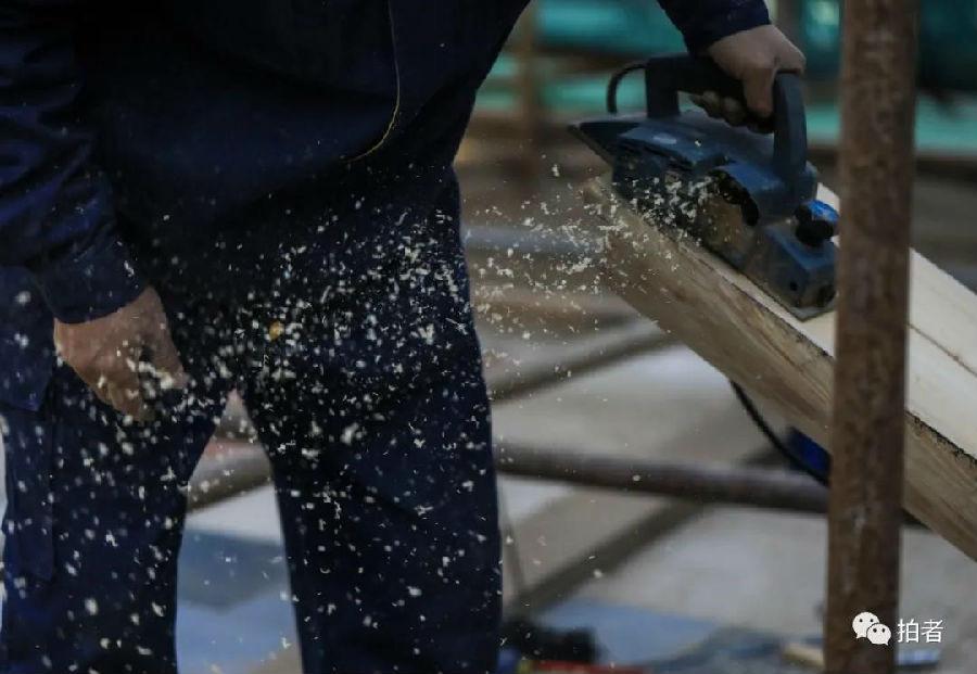 △ 郝保军使用电动工具平整连接面。他说,这些年,电动工具的使用极大地提高了木工的工作效率。
