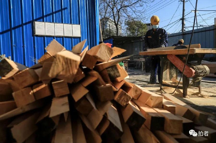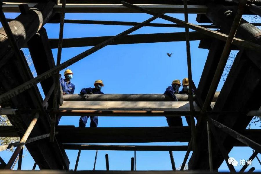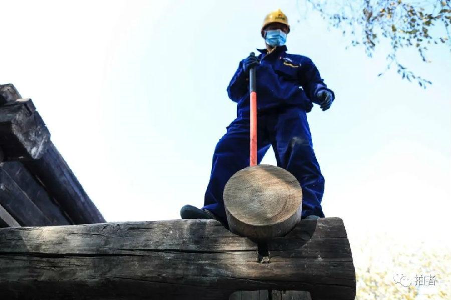 △ 工人为一些开裂的檩子重新补上木料,好继续使用。他说:“这样的木材不影响使用寿命,这也是严格按照修旧如旧的标准操作的。”