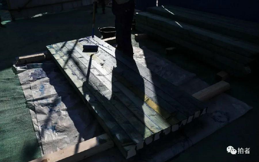 在休工期,有些工作仍在进行,比如将明年要用的一些材料制作好。在东路工地的一个空地上,搭建了一处简易的木料制作坊,就地制作修缮需要的椽子。木工师傅将切割好的椽子平放在地上,刷上蓝色的防腐涂料,一共要刷四道。