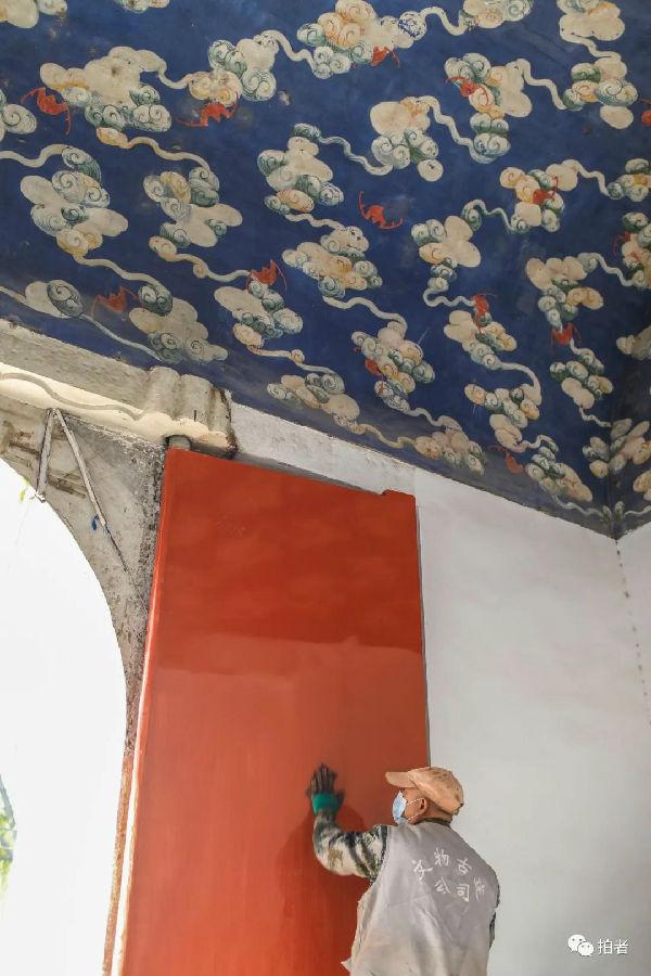 △ 万寿寺中路山门,工人在打磨新上漆的大门。大门上方是保存尚好的清代“洪福齐天”彩绘壁画,明年将对其启动保护修复工程。