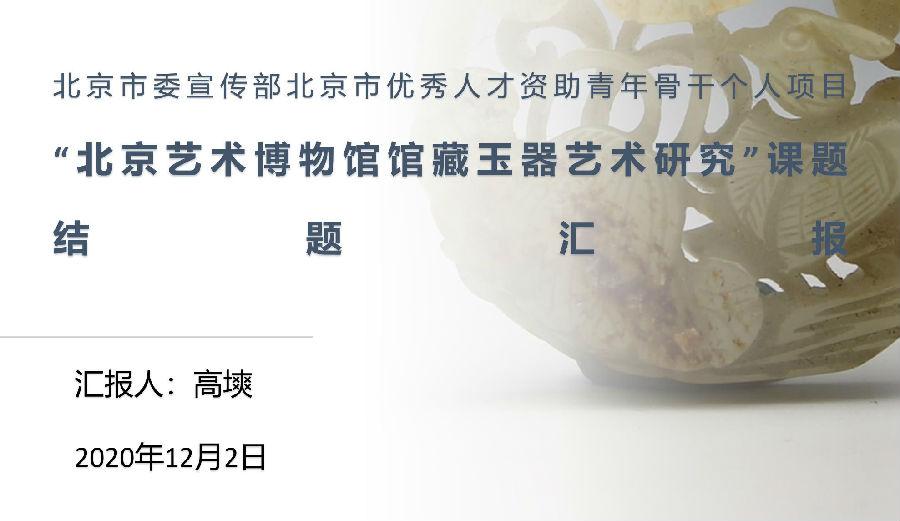 《北京艺术博物馆馆藏玉器艺术研究》课题是“北京市委宣传部北京市优秀人才资助青年骨干个人项目”。课题于2019年11月启动,2020年12月完成。课题以北京艺术博物馆藏玉器为研究对象,以时代为轴,按功能划分,梳理了各个时期馆藏玉器的造型、纹饰特点;通过与考古出土器类比,以科学检测为辅助手段的方式,对若干件馆藏早期玉器的定名、时代进行了调整;运用3D激光扫描技术,拣选若干件造型纹饰精美的玉器进行高清数字拍照与纹饰线图提取,为网络宣传与未来的展览展示收集素材。