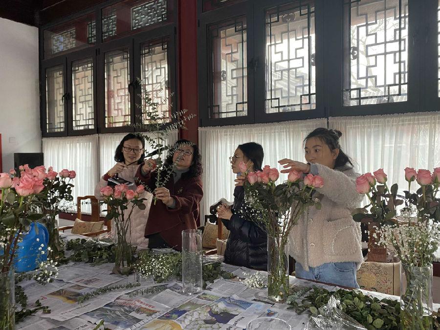 随后,大家自己动手,发挥想象力,亲手插出一束心中最美的花,并在党支部书记的指导下,团结协作共同参与制作美食。