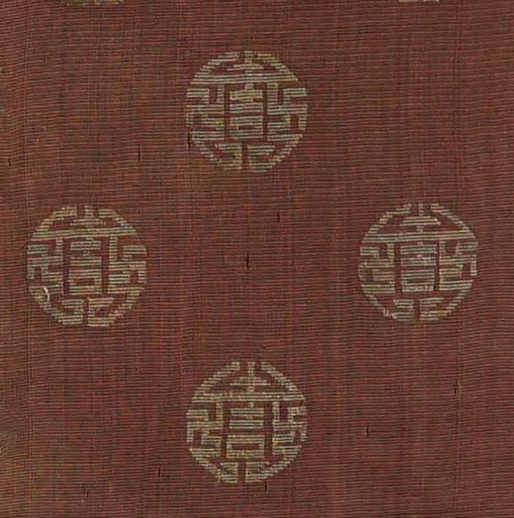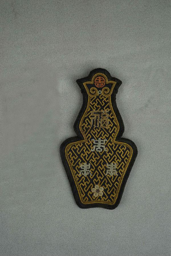 是指直接将具有吉祥含义的文字作为纹样用来装饰,常用的字有福、寿、喜、卍等。为了获得良好的装饰效果,这些文字通常会被加以艺术化的变形,如“寿”字经常使用长形的“长寿”和圆形的“团寿”两种变体,分别表达长命百岁和生命无限的含义;而“卍”则借伸出的四端彼此连接构成连锁花纹,意为绵延不绝。