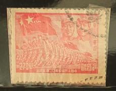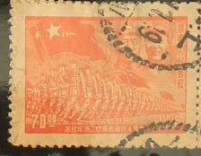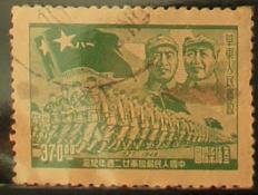 1949年8月,华东邮政管理总局发行。全套共5枚,图案、颜色基本相同,分别为:270元(红色)、70元(桔黄色)、370元(绿色)。图案为毛主席及朱德总司令画像及在“八一军旗”的旗帜下前进中的中国人民解放军。邮票底部有“中国人民解放军廿二周年纪念”字样。另有一枚红色邮,面值100元,但是在邮票底部没有“中国人民解放军廿二周年纪念”字样,有“西南区”三字。