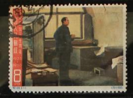 1965年1月31日,由中国人民邮政发行,全套3枚,图案分别为“决战前夕”“毛主席像”和“娄山关大捷”。我馆收藏的这两枚为其中的第一和第三枚。“决战前夕”表现的是身穿灰蓝色棉衣、右手叉腰、左手拿着香烟面对墙壁上的军事地图聚精会神谋划作战方案的毛泽东,图案形象地展现出毛泽东运筹帷幄、指挥红军赢得娄山关大捷、四渡赤水等军事胜利的光辉形象。“娄山关大捷”表现的是毛泽东在1935年2月底登临娄山关指挥作战的情形。邮票画面上,娄山万峰插天,苍山如海,红军战士急速前进,毛泽东站在高地凝视远方。