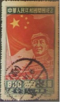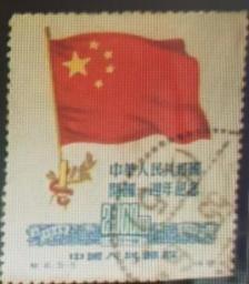 1950年10月1日发行,这是新中国第一次出现的国庆题材邮票,邮票全套共5枚,面值为100元(紫)、400元(红)、800元(绿)、1000元(黄)、2000元(蓝)。图案为五星国旗,寓意新生的共和国欣欣向荣,在中国共产党的领导下的全国各族人民大团结。旗杆上红色飘带系着数字1,表示中华人民共和国成立一周年;国旗下方为“中华人民共和国成立一周年纪念”字样。