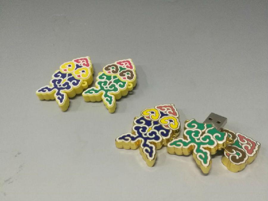 此款U盘分别以乳胶滴彩和合金珐琅工艺制作,两侧有环扣,可以添加流苏装饰,造型生动活泼。