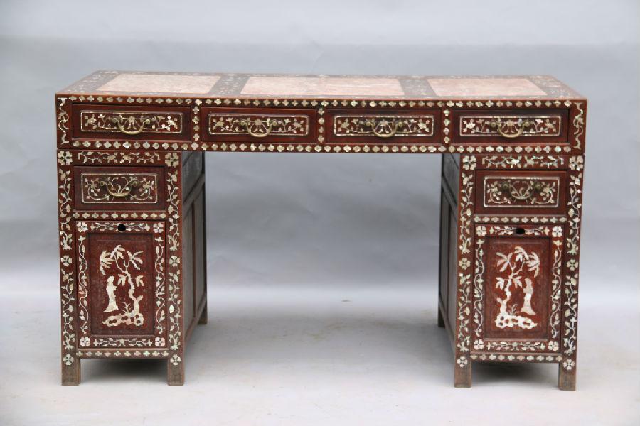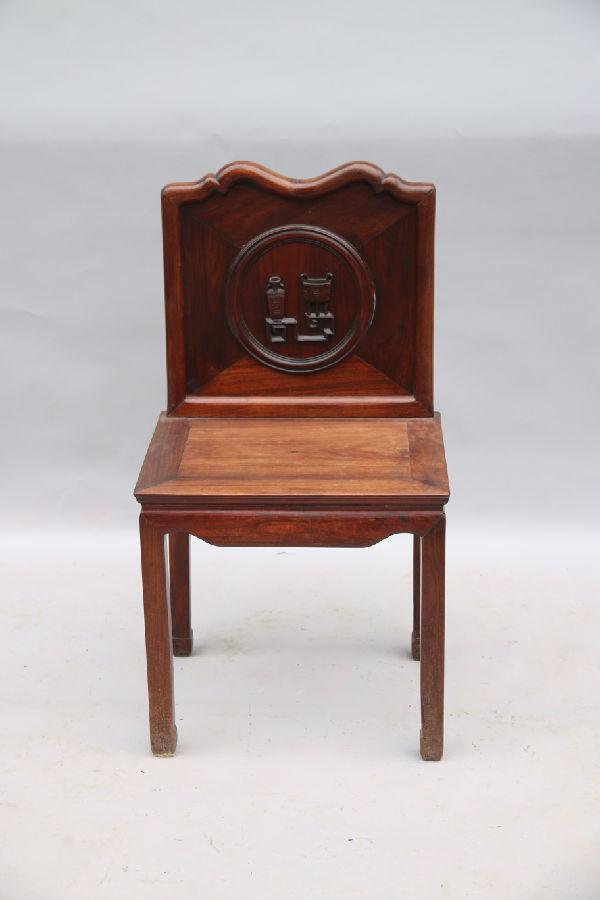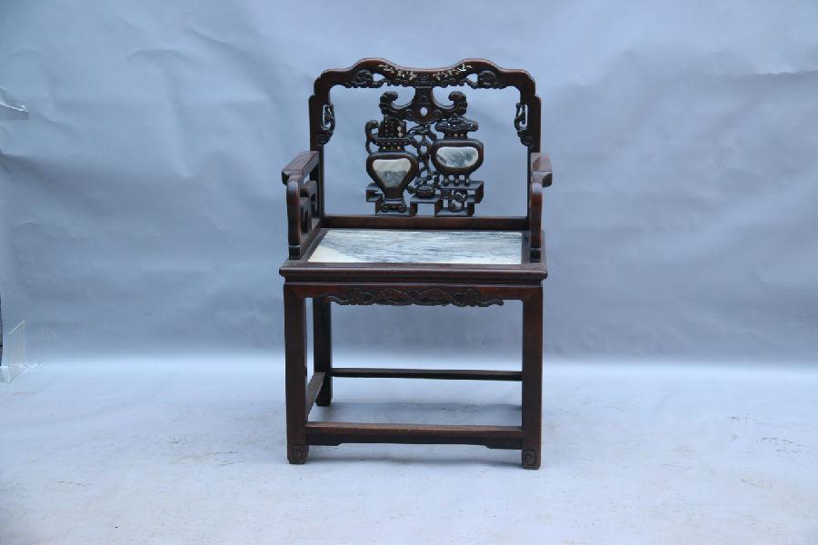 酸枝木透雕博古图嵌螺钿石面扶手椅 清