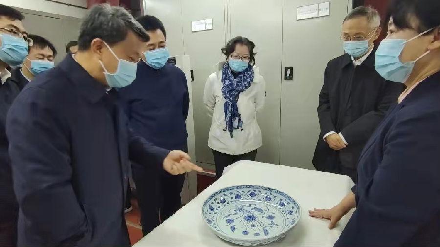 图4,陈名杰局长、王丹馆长等陪同杨斌副市长查看万寿寺文物藏品安全