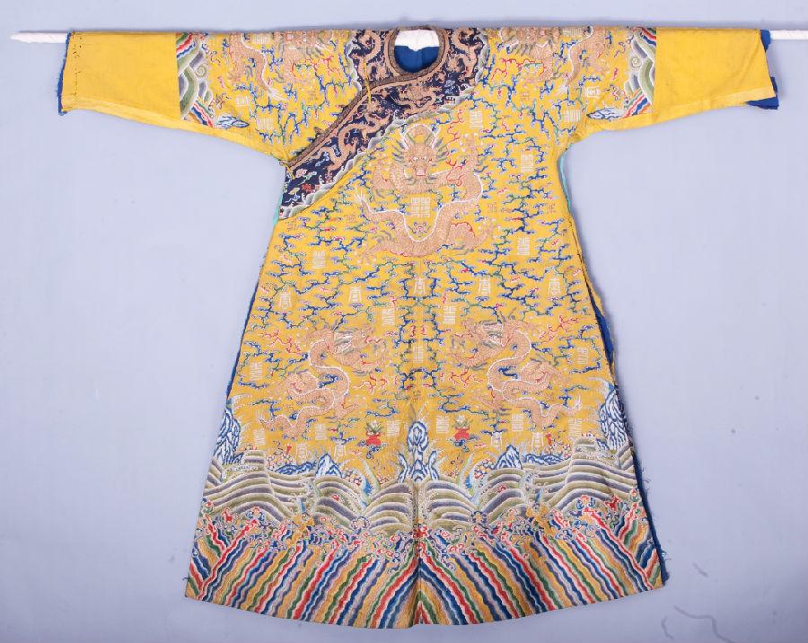 清乾隆明黄绸绣五彩云蝠万寿金龙夹袍