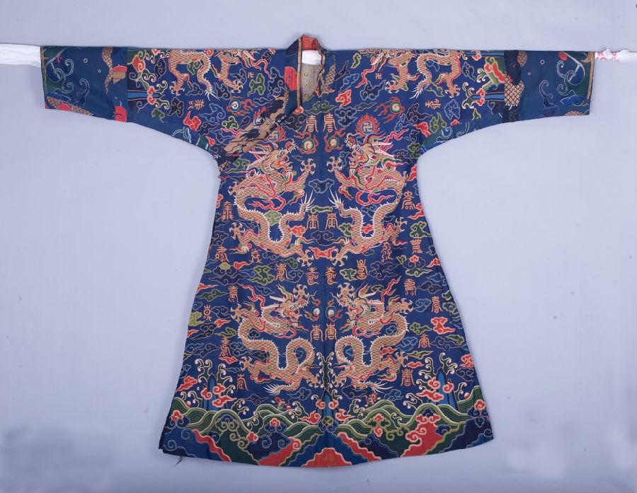 清康熙蓝地缂丝五彩云龙百寿吉服袍