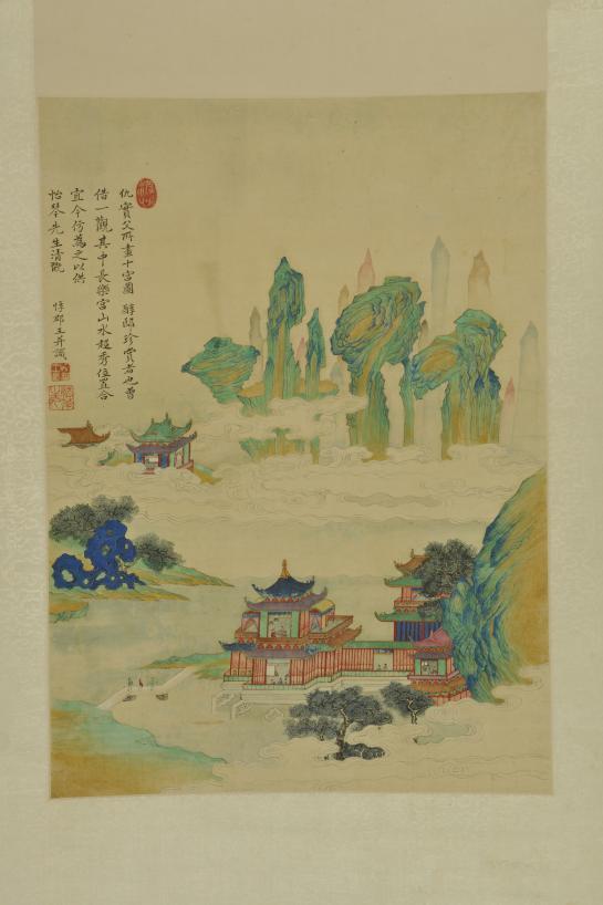 《长乐宫青绿山水图》系列文创产品图案出自北京艺术博物馆馆藏清惇郡王《长乐宫青绿山水图》。原作为设色纸本立轴,作品仿明代画家仇英的青绿山水风格而作,设色浓艳,用笔工整,楼台秀美,山石独特。