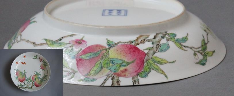 雍正粉彩还流行“过枝”技法。盘、碗的图案花纹,从器身到器盖,或从器外到器内连续彩绘而成,题材主要为桃果、牡丹、玉兰等。