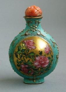 清乾隆松石绿釉珍珠地开光粉彩描金花卉纹鼻烟壶