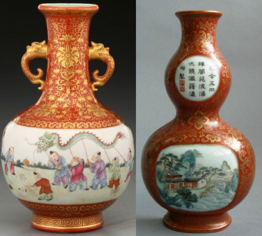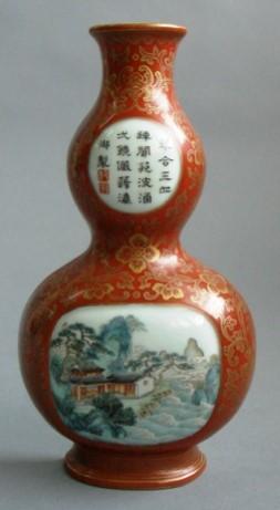 清乾隆红釉地描金开光粉彩山水诗文壁瓶