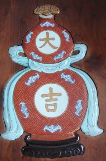 其三,粉彩图案充满了吉祥寓意。“图必有意,意必吉祥”的理念贯穿了清代中后期工艺美术的发展,瓷器上的绘画也不例外。传统的吉祥图案如龙、凤、桃、灵芝等仍然沿用。同时,出现了很多通过谐音或特定的物件组合而成的吉祥寓意。在瓷器上比较典型的搭配组合有:竹、菊、鹌鹑寓意“安居乐业”;蝙蝠、团寿寓意“五福捧寿”;羊寓意三阳开泰;大象、宝瓶寓意“太平有象”等等。与宗教有关的“卍”、八宝、八卦、八仙,也成为代表吉祥寓意的特定纹饰。此外,在瓷器上直接书写“福”“寿”“大吉”等吉祥文字,直抒胸臆,表达吉祥寓意也变得流行。