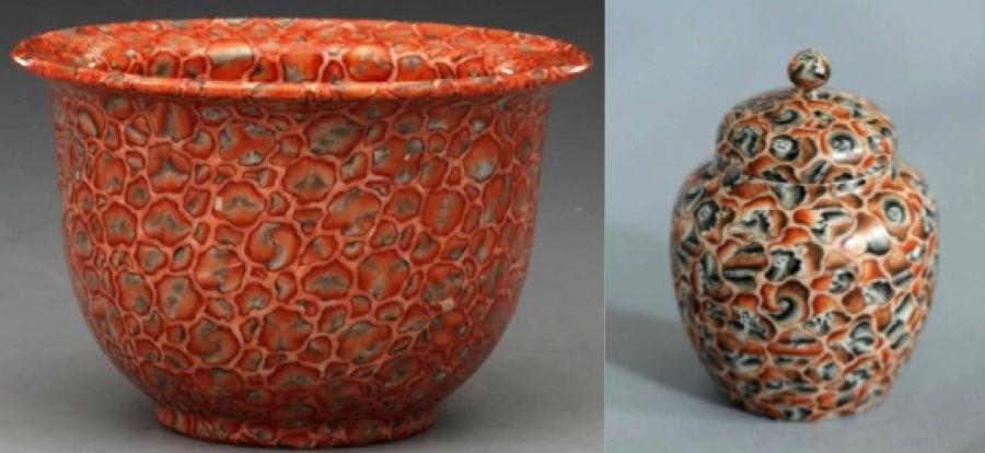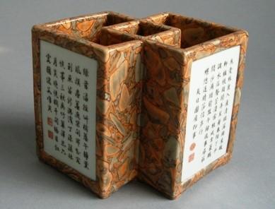 其五,流行仿其他材质、纹理。由于粉彩的材料可以表现非常细微的变化,写实感强,乾隆时期的粉彩,为显示高超的画彩技术,流行以彩绘来模仿石、木、漆器、竹等天然质感。成为粉彩瓷器中特立独行的一类。