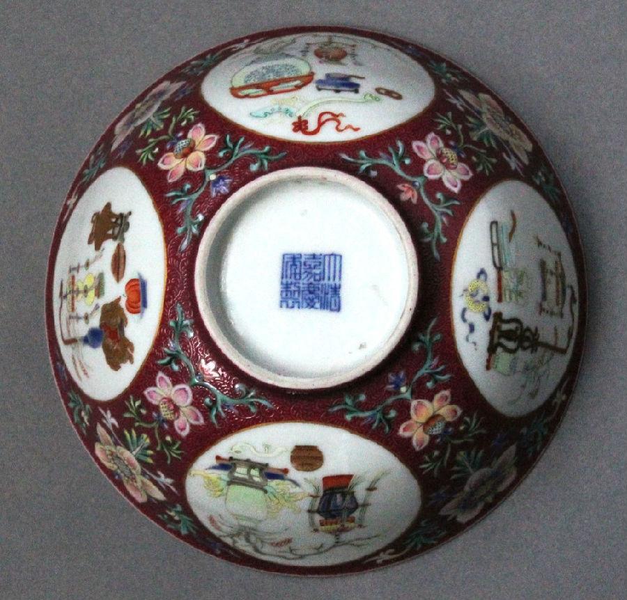 清嘉庆胭脂红地粉彩轧道开光博古图碗