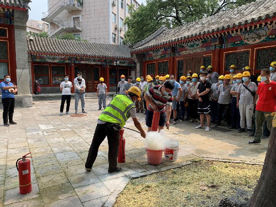 再次,保卫科工作人员现场讲解消火栓和灭火器的操作与使用。施工人员现场进行实操训练。