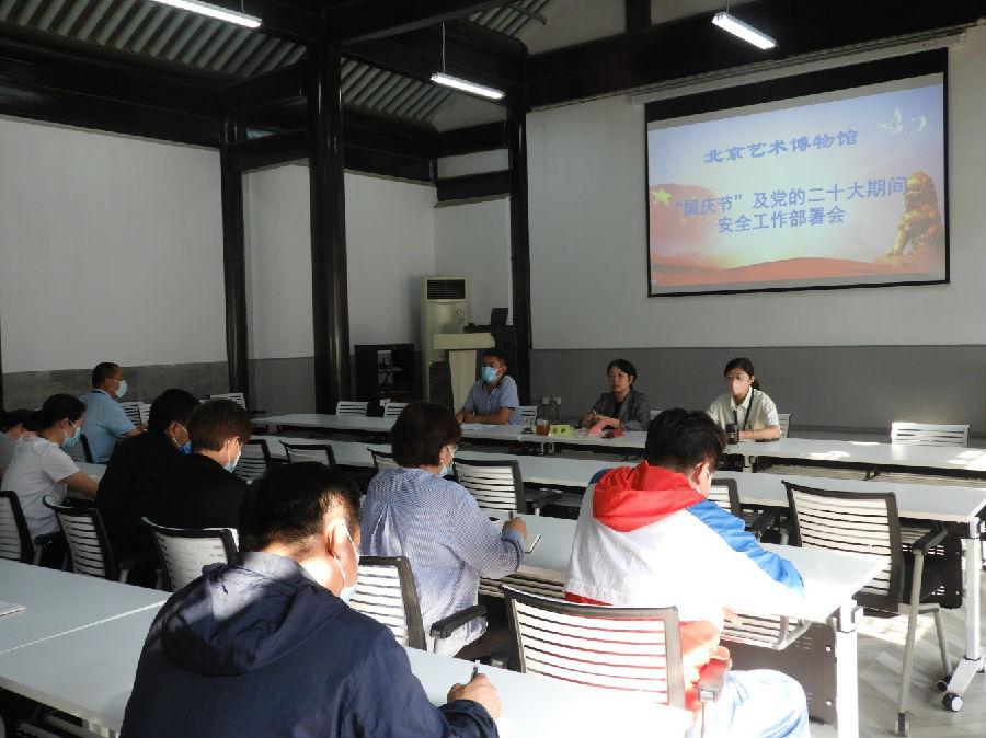 会上,传达学习《北京市文物局关于做好国庆期间安全防范工作的通知》、《‘喜迎二十大,全力保平安’消防安全十大攻坚行动方案》等文件,并对国庆节及二十大期间的安全与防疫工作进行了部署。会议要求各部门节前要进行安全隐患排查,清理易燃可燃物;加强对重点物品及重要文件的管理;加强办公区、开放区的清扫;对消防设施进行检查测试,确保设备状况最佳;做好应急准备工作,开展消防实战演练;加强人员进出管理,严把出入口关,严格落实各项防疫政策;加强值班值守,保持信息畅通;值班人员严禁迟到、早退、脱岗、漏岗。