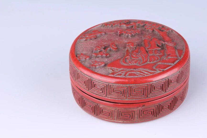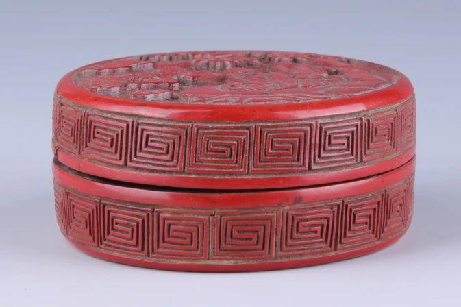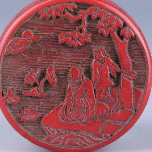 北京艺术博物馆藏剔红周敦颐爱莲图圆盒,通体髹朱漆雕花纹。盖面雕一长者坐河边枫树下赏莲,身后一童子持扇侍立,取周敦颐爱莲图之意。
